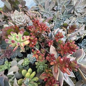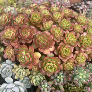 今朝の写真は、ラブリーローズ鉢になります🌹 ◇1枚目→現在の様子 ◇2枚目→おおよそ2ヶ月前の様子(2025.11.18投稿分) ◇3枚目→おおよそ1ヶ月前の様子(2025.12.14投稿分) ◇4枚目→すぐ横のレティジアとフェロロボス ◇5枚目→庭のレティジアとハボタン このラブリーローズたちは、直径24㎝のスタンドカップ プランターに寄せ植えしております。 寒さに当たり、たまに雨に当たって、1月に入り、その姿はギュッと更に引き締まってきました。 ※2.3枚目に移っているラブリーローズ脇のアロマティカスは、耐寒性が非常に弱いため、冬期の間、夜間のみ玄関内に取り込んで育てております。 4枚目は、すぐに隣の壁際にありますレティジアになります。 このレティジアたちは、真っ赤に紅葉し始めていますが、庭にあります拭きっさらしのレティジアたちは、未だ、あまり紅葉していません。 同じ品種でも、置き場所(日当たり・寒さ)やお水やりの頻度などによって、生育していく姿が全く異なるのも多肉の魅力のひとつだと思っております🌿