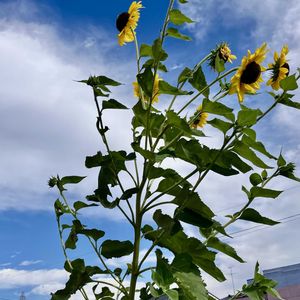 こんにちは😃 昨日 出掛け先からの通り道で 向日葵さんが🌻🌻🌻 青空に何か歌ってた🎵🎶 ホッとした気分の日だから😃 ②今朝の畑の食用菊 口に入るのはもう少し先🌼 ③風車菊もポット植えを買って 三年目 咲き出したよ🌸 ④小菊 小さな花ですが💕💕🥰 ⑤畑の脇に 放り出したような ⁈ ヘチマでした😆🌼💚 🏷️黄色い金曜日 参加します♪