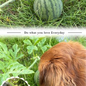 テオ君🐶と朝のお散歩🐾 少し前にupしたスイカ🍉が大きくなっていました🙌✨🍉 テオ君も興味津々🤩 食べないでね(*´ω`*)