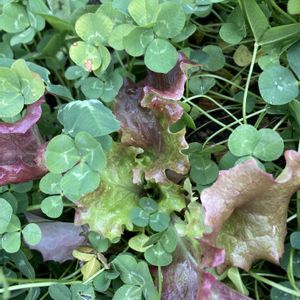 クローバー畑にしていた家庭菜園エリアから野良レタスが生えてきている 昨シーズンのこぼれ種から?