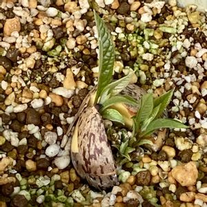 アボカド発芽🥑みつごちゃん❓ キッチンのカウンターでしばらく水耕栽培していたアボカドのタネ🥑 パッカリ割れた後、根っこが出たので土に植えたけどなかなか発芽しなくて、寒いしなぁと諦め半分で小さい温室の片隅に置いたら発芽した👀 「あれ?ふたごちゃん?」って思ってよく見たら、これみつごちゃん?