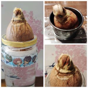 悲しいお知らせ😭 育てようとした🥑アボカド隣に置いたまま左の瓶を工作してて、ぶつけてアボカドをテーブルの下に転がしてしまいました。 芽の方からおちたのでしょう、茶色に変色して周りの膜より下がっています。😱 種が安定して立っていれるように、考えて作っていたのに、なんとそれが仇になりました😵