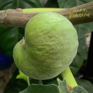 グリスビファレとされるイチジクを去年の1月から挿木して育てておりますが、摘心後に伸びた新梢に小さな果実が膨らんで来ました 果実が成熟しましたら品種名を確認します 摘心2025/11/10 8号鉢に鉢増し2026/01/13 2026/01/14撮影