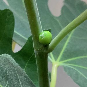 グリスビファレとされるイチジクを去年の1月から挿木して育てておりますが、摘心後に伸びた新梢に小さな果実が膨らんで来ました 果実が成熟しましたら品種名を確認します 摘心2025/11/10 8号鉢に鉢増し2026/01/13 2026/01/14撮影