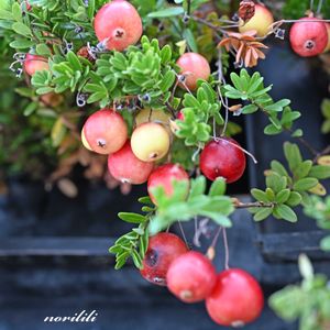 か、か、か、か、かわゆい! (⸝⸝◜~◝⸝⸝)🍒 クランベリーがやって来た! 細い糸のようなもので 実がぷらぷらぶら下がってます🍒 クリスマスツリーの オーナメントのようです🔴🎄