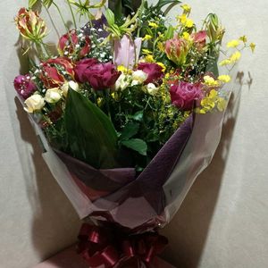 🏷️月曜日にはバラを 🏷️月曜日にビタミンカラー 🏷️月曜日を爽やかに 🏷️元気な月曜日❗ 大きな花束頂きました 色々なお花入っています 窮屈そうなので解体します バラ 薔薇 リンゴ 林檎 バラ科の植物です