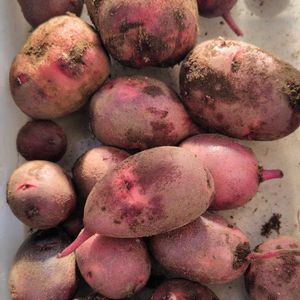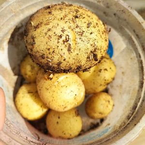 春にジャガイモを収穫した時に出た豆芋を保管しておいて、9月ごろ自然に芽が出たところで鉢植えに植えて育てたジャガイモ、ハウスの中でなんとか耐えてましたがここ数日の冷え込みでいよいよ枯れたのでポットごとひっくり返して収穫。数は少ないですが、キレイでいい芋が出来てました✨ 春の反省を活かしてきれいな土で育てたので春ジャガよりも肌がキレイで文句なしです。芽が出た豆芋を3号ポットくらいのビニールポットに植え、元肥をガッツリ入れて自然に育ったら、大きい芋は8号鉢、小さいものは4号ロングとか5号の黒ビニールポットに鉢増ししてその時に1回だけ土寄せしてあとは収穫まで水やりのみでした。 食べるのはちょっと怖いかなってくらいの小さいサイズの芋に関しても、元は1cmくらいの豆サイズ▶うずらの卵くらいのサイズのキレイな芋がたくさん出来たので、そのまま乾いた土に軽く埋め戻してガレージへ。来春のジャガイモ栽培の種芋にします。