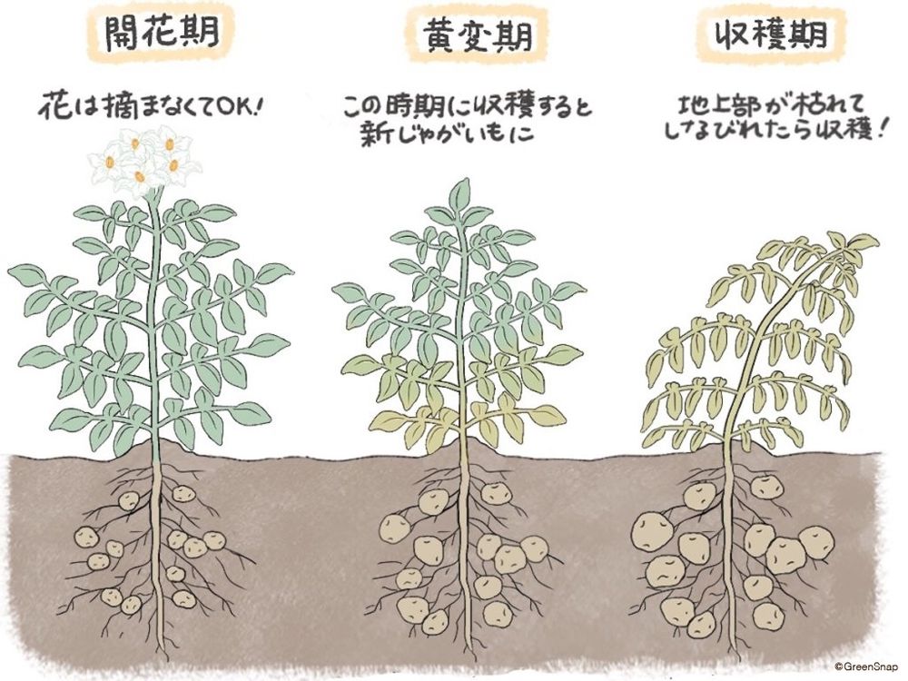 じゃがいもは地表からでている大きな葉っぱから光合成をして、芋にでん粉を溜め込んでいきます。光合成をよくさせると大きくたくさん収穫できますよ。