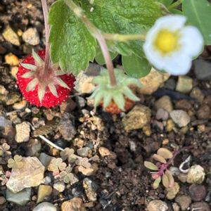 寒いけど、ワイルドストロベリーに、小さな苺🍓ができています。 ハツユキカズラが赤く紅葉🍁。 季節感があって良いですね。 ハツユキカズラは根が暴れるので、お世話がたいへんですが、 鉢植えだと静かにしてくれて、助かります🪴