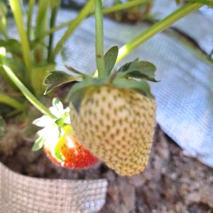 苺二つしか大きくならず!! そして一つは色づきませんが!!! 種が赤くなってきてるんですよーわかります!!!ほとんど赤いでしょ? これ白苺でしょうか!、! 今年埋めた白苺の種は全滅させたくさいのですが!!!できてる。 私オリジナルの白苺!! でもまずいのかなー?私の白苺!! もうすぐ様子を見て食べてみたいと思います。 2枚目は同じ日に咲いた苺王道の赤い苺も結構色付いてます🍓 3枚目は灰色かび病らしいです。腐りました。 二つだけ食べれそうです。 白苺楽しみだなー🥰