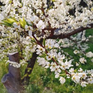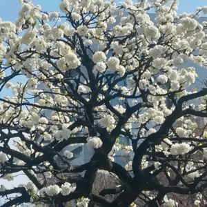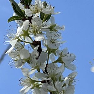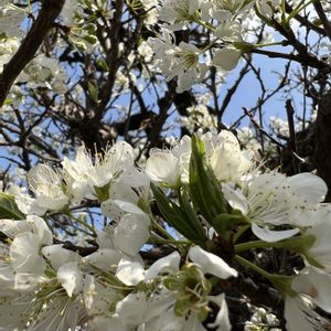 青空☀️とスモモ🥭の花✨。 果樹園の早生スモモの純白🤍の花が一気に咲き始めた。 平年より5日〜1週間は早いねー😲。 去年は大豊作だった、我が家の本命スモモ・大石早生。 樹上完熟果の味わいを今年も堪能できるかな?🤔