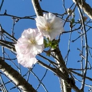 こちらも今の時期に??お花がボツボツ咲いています。花桃です。 高い所にしか咲いていなかったので脚立に登って1輪だけでも咲いているのを間近で見たいと脚立に登って高枝切り鋏で切ろうとしたら、横に倒してしまい棒が折れて壊れてしまいました😨💦 仕方ないので、落ちていたお花(一枚目二枚目)を撮ってみました。 こちらもいまの時期に?って思ったお花です。