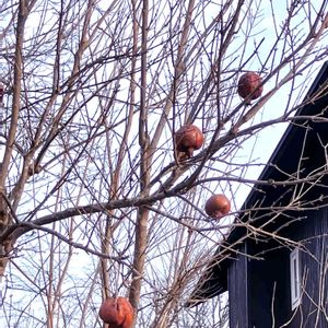デーン!ザクロ 葉も落ちて… ザクロの実が数個残っている状態。 ザクロの木を見るのも初めてかも…