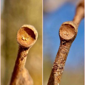 サルナシ(猿梨)の冬芽と葉痕 花期は、5〜7月で白い花を下向きに付け、秋にはキウイに似た実を結ぶ! 冬芽は、隠芽と言って葉痕の裏の膨らみにあります。 おとぼけ顔がかわいい💕