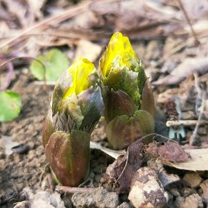フクジュソウの蕾 寄り添っています☺️ ふきのとう(2-3枚目) 多くのカメラマンに撮られていたアオジ 後ろ向いた時のお尻が大変可愛かった🐦️(4枚目) ランチのデザートの金柑パフェ(5枚目)