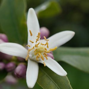 🌳我が家の🇫🇷フランス式庭園 🍋レモンの花🤍 🐝蜜蜂が訪花に来てのでパシャリ📷 この時期、まだ蕾が多く 開花前に取れやすいので気を付けないと