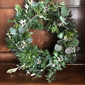 クリスマスリースを作りました。 公園で拾ってきた南京ハゼの実 友達に貰ったオリーブ あとはウチの庭の 柊、伽羅、ユーカリポポラス、ブルーのコニファー