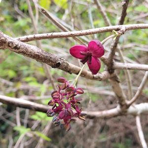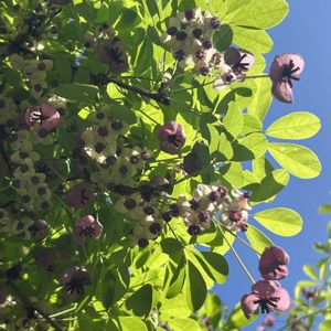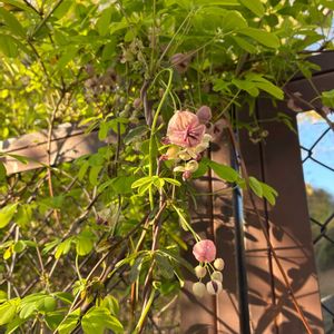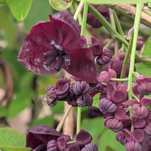 フルーティな今年のワイン🍷は 素敵な色合い➰🍷 陽射しを透かす花姿は気品溢れる ルビーのイヤリング➰🤗🎵🎶 首が痛くなるほど眺めて パチリ➰📸 ゴヨウアケビとミツバアケビは 個性豊かで魅力的🎯 このキュートな花からあの 実ができるなんて想像不可🤣 明日は雨☔ 今日を楽しみましょう🤗☝️➰🎵🎶 ミツバアケビ🍷