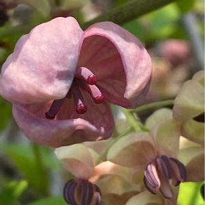おはようございます😊 アケビ アケビ科 今年もご近所の月極駐車場🅿️フェンスに絡んで咲き始めました💕 雌雄異花どちらも可愛いです😍 3枚目は色の濃い5葉アケビ💜 🏷️日だまりの日曜日 🏷️日曜日は日本を感じる和の花 🏷️ビューティフルサンデー