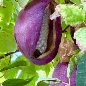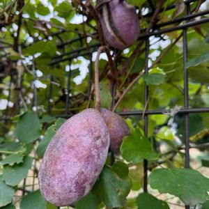 おはようございます😊🌤️🍂🎶 花友さんが春に「アケビ」の木が あるけど実がならないと一本だけでは ならないよとご近所さんのアケビの 花を頂き人工受粉をした、花が終わった頃 小さな実がなっていると報告あり そして昨日花友さんこのアケビを持って いらした、他のお友達と一緒に感激🤩❗️