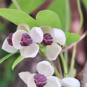 アケビの花 アケビの実は子供の頃、山へ行って食べてたのでよく知ってます。 しかし、花を見たことはありませんでした。今日、初めて見ました。