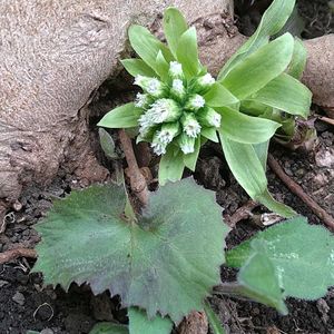 おはようございます😊 ① サザンカの根元のフキノトウ💮😄 ② 種まき春大根とのらぼう菜🌱🌿 ③ 春蒔きスナップエンドウ🫛 ④ サクサクと美味しいサニーレタス🥗😁 ⑤ 昨年12月に開花のミツバです♣💮 🏷 今日のお花ミツバ♧