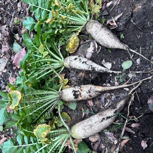 初、栽培の大根ラスト4本収穫しました〜! 思ったほど大きくならなかったけど日当たりとか改善点はいろいろ見つかったので来年はもっと上手くやれそう✌️