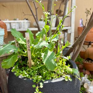 春の七草の寄せ植えが今、花盛り 1月に七草粥のために収穫しましたが、さすが野草、すでにボーボーです。 ハコベ、コオニタビラコ(ホトケノザ)、ナズナが咲いています。 1月にはミニサイズしか収穫できなかったカブ(スズナ)も、残した株のほうが収穫できるサイズになりました!