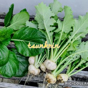 しばらくぶりの投稿です。 今年初の投稿は、プランター栽培のコカブと小松菜。 元からコカブなので、直径3センチ位と小さいです。葉っぱは、ミックスビーンズとオリーブオイルで炒めて、粒マスタード和えに。カブ本体は、酢漬けに。 小松菜は、昨年蒔いた種のひょっこりはん。キバナコスモスの下から生えて来ました。トウ立ちしそうになっていたので収穫しました。