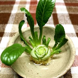 コンビニで買った小松菜。葉の根付きのところにチビ葉が幾つも出ていたので、水栽培してみました。皿の直径6cmです。