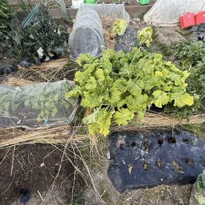 シェア畑深大寺からの写真です。 1枚目:ダイコン 2枚目:葉物野菜 トンネルの中です。 3枚目:茎ブロッコリー 茎をメインで食べます。 4枚目:芽キャベツ 茎?が伸びて ぶどうのようにたくさん 小さなキャベツが付きます。 5枚目:ソラマメ 行灯づくりの不織布に囲まれて 防寒対策がなされています。