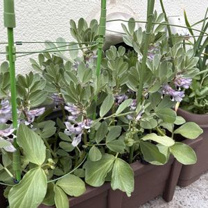 テラスで育ててる春菊。まるでカーペットのようです。そら豆もたくさん花が咲きました🌸