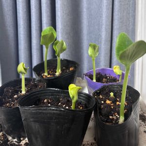 かぼちゃ🎃発芽中 去年暑さでほぼ溶けたから今年は少し早めの時期に育てたい、、 室温が20度あるから温室みたいになるんじゃん?!と思って室内で管理し始めたらいい感じ✌️ ベランダで発芽させてる種は寒すぎるようでまだ芽が出ない