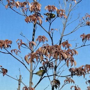バルコニー小庭で小鳥さんの足場になっている常緑ヤマボウシ。強風吹き荒れる🌀悪環境で年々弱っていきます😢枝にメジロちゃんがつがい𓅫⸒⸒𓅫⸒⸒でやってきました❤️網戸フィルターがあると外からは見えないらしく近距離📸です 🍊が大好きですチウチウ ヒヨドリちゃんと取り合いです 冬のバルコニーはにぎやかです🥰