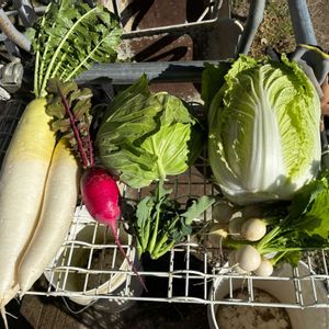 おはようございます♪ 今日はポカポカ陽気で12月下旬とは思えないです! 今日の収穫 大根2本(1本は成長点が害虫に食されてました😰) 赤大根キャベツ、白菜、小蕪、茎ブロッコリー(ブロッコリーはもう少し欲しいなぁー) 今年は年末にもう一度収穫しますが一生懸命食べないと消費しきれません‼️