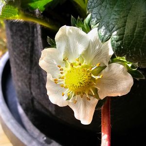 花が咲いた!受粉受粉! 冬でも晴れの日はぽっかぽかになるテラス環境を利用してイチゴ栽培しようと思い立ち。 吊り下げる布のプランターを購入したものの…。 土が入るとかなりの重さになるし、更に水やった時の重さも考えると、とてもじゃないが吊り下げる気になれず置くことに。