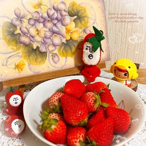 🏷️毎月15日はいちごの日 🏷️毎月15日はインコの日 🏷️お野菜キャラ 🏷️お散歩ちゃん…色々で 投稿させて頂きます🍓 今日は買い物に行ったら果物コーナーに いちごが沢山並んでいました 地元産と熊本産がありましたが 今日はキャクターの絵のある 「ゆうべに」を選びました まずはお皿に盛り付けて イチゴマンやコルクの小鳥(ひよこ)と一緒に 後ろのトールペイントは 教室が終了するので 記念にというか何というか 先生の描いてきた作品を 生徒みんなが何点かづつ 頂いた中の一点 本物の花ではありませんが こぺんちゃんの許可を頂いて 🏷️一般ジーの会♪ 使わせて頂くことになりました☺️ ビオラの絵と 裏返すとスミレの絵になっています 2pic目 熊本産の青果にはよく くまモンの描いてあるのがありますが こちらはその他に 「ゆうべに」のところに 小さなキャラクターと 名前も描いてあります JA熊本経済連のイラストマークも 何となくキャラクター(?)っぽいものが お散歩ちゃんに🍓を着せたことは まだなかったので メイドスタイルの3人に纏わせてみました❤️