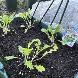 やっと暑さが収まったので、水菜を 外の平面プランターに植え付けしました。 そして暑さが収まる気配を感じていなかった9月上旬、6号鉢に播種&ライトを設置して室内管理栽培をしていた和風ベビーリーフミックスがありまして、 そちらは収穫時期到来&もう少し育てるなら間引き時期になったので 収穫と間引きをしました。 間引きしたものはベビーリーフサラダにして美味しくいただきました♪ 和風ベビーリーフミックスの中身は、京水菜・壬生菜・広丸葉高菜・紫丸葉高菜で、それに小松菜の種を少し混ぜて種まきしました。 残したものはそれぞれ1種類ずつ…のはずです。 紫丸葉高菜はもしかすると、無いかもしれません。