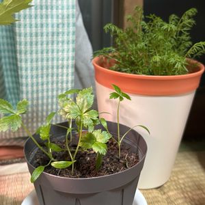 こちら、屋内栽培の種から育てた植物達。写真①はミツバとジャーマンカモミール、写真②は水菜です。 ミツバもジャーマンカモミールも小さな種からニョキニョキ育ってくれています。水菜は、残暑が長かったので始めた室内栽培。他にも一緒に小松菜と高菜、壬生菜が育っていました。早取りならそろそろ収穫期でしたので小松菜達は収穫。水菜のみもう少し大きく育てる予定です。
