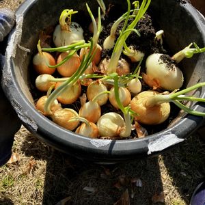 去年の春の玉ねぎです。植えれば葉玉ねぎとして楽しめるらしいですね。 (2枚目)ブロッコリー追肥と葉かき (3枚目)葉はウサへ