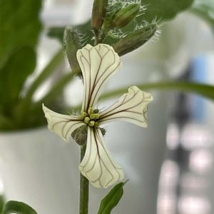 ルッコラ 花びらに入る紫の筋が特徴的です* 綺麗な十字に開きました* アブラナ科 葉だけでなく、花や蕾も無駄なく楽しめる、利用価値の高いハーブ 和名「キバナスズシロ(黄花蘿蔔)」 イタリア語で 「ルッコラ」 英国やフランスで 「ロケット」 米国で 「アルグラ」 などとも呼ばれている。