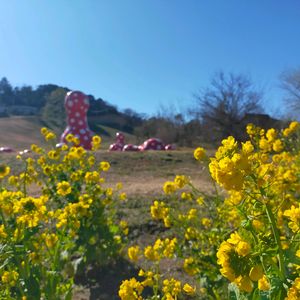千葉県木更津市の農場テーマパーク「クルックフィールズ」へ 晴天に菜の花が映えます (赤いのは草間彌生作品) 似てるけど違う「チーマディラーパ」も咲いていました(4-5枚目) 葉がちれていないのが特徴のようです
