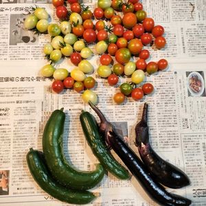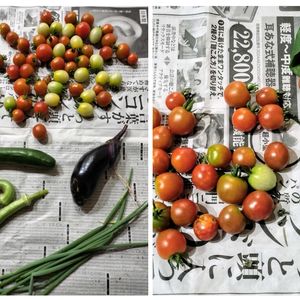 1⃣左/水曜日 右/今日の収穫 仕事帰りの見回り、ミニトマトがよく採れる。 今日はナスときゅうりが沢山採れたので帰りに実家におすそ分けしました。 2️⃣ きゅうり: 今年は沢山採れています。 3️⃣ナス: やっと収穫できるようになってきました。 4️⃣オクラ: こちらも少しづつ収穫出来てます。 5️⃣ゴボウ: 花が咲き出しました。