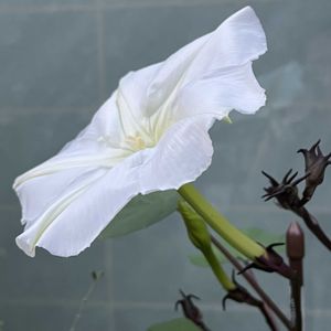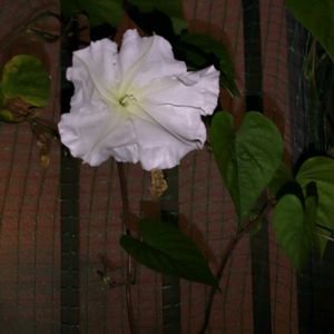 ソフトクリーム🍦の蕾出来ても咲かないうちに落ちてしまう 時には咲いたかと思いきや萎んでいる 夕べ10時過ぎに何気なく外みると、何とやっと開花しています 慌てて外に出て撮影 かなり大きく真っ白な綺麗な花びら お初だったので興奮しました ユウガオと苗もらいましたが、ヨルガオだったみたいです