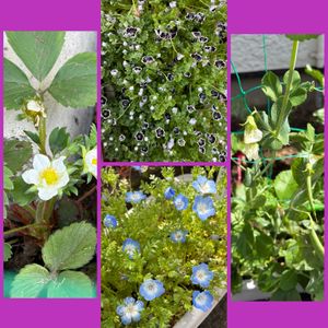 おはようございます。晴れ、14.6℃、10:20ちょうどいい、昨日の花粉量24個少ない。久しぶりに良い天気です。イチゴ2540日目今年も花が咲き出しました。ネモフィラ、ペニーブラック&インシングニスブルーたくさん咲きました。つるありスナップ花&実もでき始めました。今日の収穫はチマサンチュ&レタスです。😻🥰😍☺️😸😋