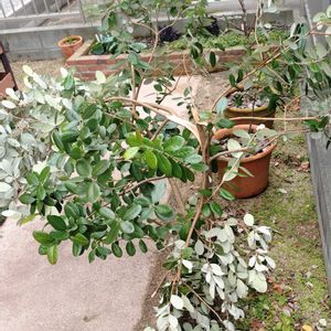 フェイジョア 先日の雪で主幹がボキッと😭 雪が溶けたので、とりあえずガムテで補強 ついでに剪定 のばしすぎかなぁと思いつつ育てていたので 思い切ってバッサリ 切りすぎやろ!!ってくらい剪定 このコは枝の途中から芽が出ることを確認の上です! 何とかなるのか????
