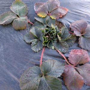 シェア畑深大寺で育てている イチゴです。 中心から伸びるランナーの赤が映えます。 今日も寒かったので 葉っぱに霜が降りています。 冬の間に寒さに当たり 春には本格的に成長して 実をならすことでしょう。