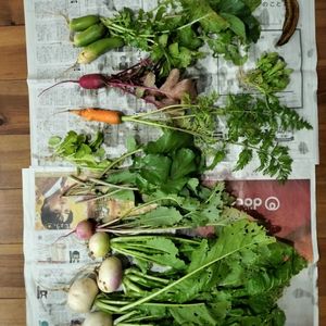 1⃣今日の収穫 聖御院蕪、ももの助(蕪) 赤大根、ビタミン大根 紅菜苔、黒田五寸(人参) 春菊間引き、菜の花間引き 四角豆種 2️⃣桜島大根 鉢に1つ植えています。 3️⃣本紅金時(人参) 唐人菜 鉢植え 4️⃣サラダほうれん草 本紅金時(人参) 使わなくなったジップロックに種をまいて育てています。なかなか大きくなってくれません。 5️⃣菊