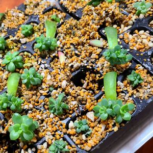 年末の片付けということで、プラグトレイの多肉葉挿しっ子達もいったん整理しました。寒さに強いマッコスと淡雪は親株の鉢に合流させて、つよつよ朧月はまとめて鳥獣戯画の豆鉢にぎゅうぎゅうに植えこみました。水決めで土を流し込んだので、扇風機の風をあてて乾燥中です。他の子達は耐寒性が心配だったり、まだ小さかったりなので、目の細かいザルを利用した葉挿しボックスに、種類ごとにまとめて植え直し、軽く水やりして土を押さえておきました。 3トレイ分あったのが1トレイ分に減ってスッキリしました。
