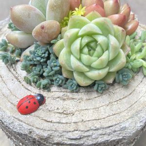 pic1,2 今朝、雨が降る前に寄せ植えしました✨ 町田のKTTのくじ引きで頂いたモルタルの切り株鉢🐞 苗はGSマルシェでお迎えしたプラグ苗と爆増中のセダムさんたち🌱 pic3〜5 先週作った寄せ植え💖 tsukiさんのテラコッタの鉢にマルシェのプラグ苗と家のセダムさんたち🌱 小さな寄せ植えはちょっとの時間で楽しめて良いですね🥰